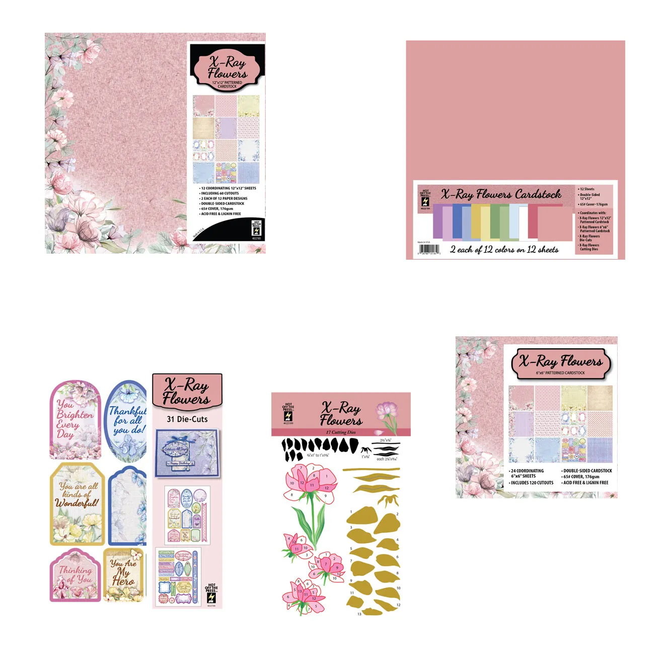 Cardstock is a good weight and colored on both sides. 12x12 printed papers are great for any project; 6x6 size is same design in a smaller format. Dies are great for using with vellum! Cutouts are beautiful and convenient when you're in a hurry. Be sure to watch Pauline's video... well worth.