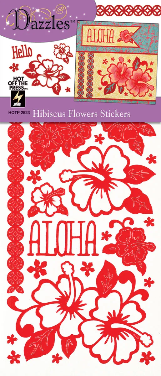 27 tropical blooms stickers! This 4"x9" sheet of red Hibiscus Flowers Dazzles™ stickers features an abundance of hibiscus flowers, "Aloha" and "Hello" greetings, a border plus lots of floral accent stickers! Hot Off The Press' Dazzles™ have the raised, glossy look of heat-embossed designs, but all you do is peel and stick! The ideal embellishment for any paper craft project, these durable vinyl stickers add a finished look to your scrapbook albums, cardmaking projects, mini albums, gift tags and more! Your Dazzles™ also come packaged with instructions for use, and tips on using a Dazzles™ transfer sheet (sold separately) so you can utilize the sticker "innies," making your Dazzles™ go twice as far! A project idea is also included. Paper Wishes Exclusive!