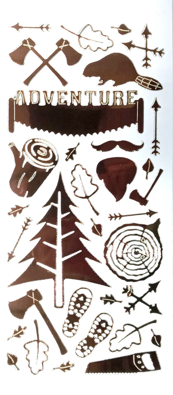 34 woodsy stickers! This 4"x9" sheet of copper Lumberjack Dazzles™ stickers feature logs, trees & leaves, plus phrases & more! Hot Off The Press' Dazzles™ have the raised, glossy look of heat-embossed designs, but all you do is peel and stick! The ideal embellishment for any papercraft project, these durable vinyl stickers add a finished look to your scrapbook albums, cardmaking projects, mini albums, gift tags and more! Your Dazzles™ also come packaged with instructions for use and a project idea! And see our Dazzles™ Transfer Sheet (link) which makes it easy to use the sticker "innies" so your Dazzles™ go twice as far!