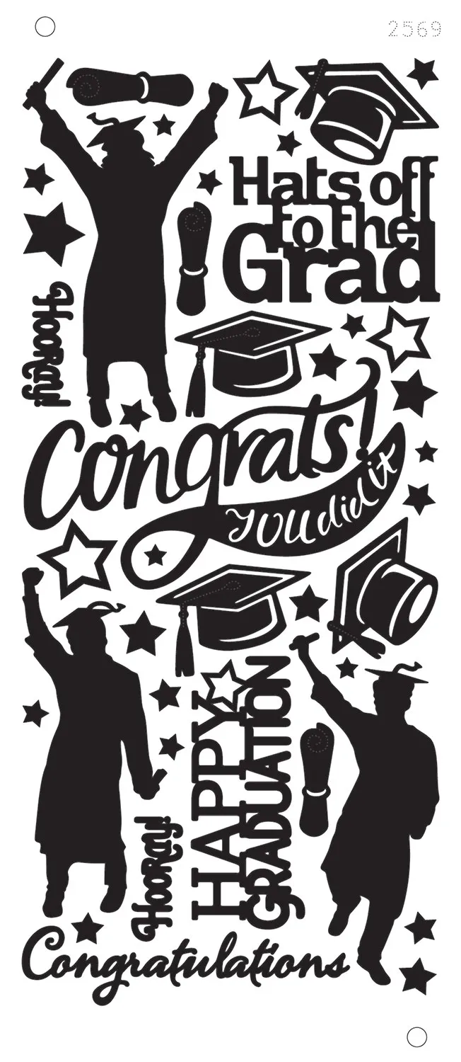 45 graduation celebration Dazzles™! This 4"x9" sheet of Graduation Dazzles™ from Hot Off The Press includes 45 black Dazzles™ featuring caps, diplomas, stars, graduate silhouettes, and greetings to celebrate all graduations, from kindergarten through college! Hot Off The Press' Dazzles™ have the glossy, smooth look and feel of heat-embossed designs, but all you do is peel and stick! Use these durable vinyl stickers to embellish your scrapbooking pages, handmade cards, mini albums, tags, and more.