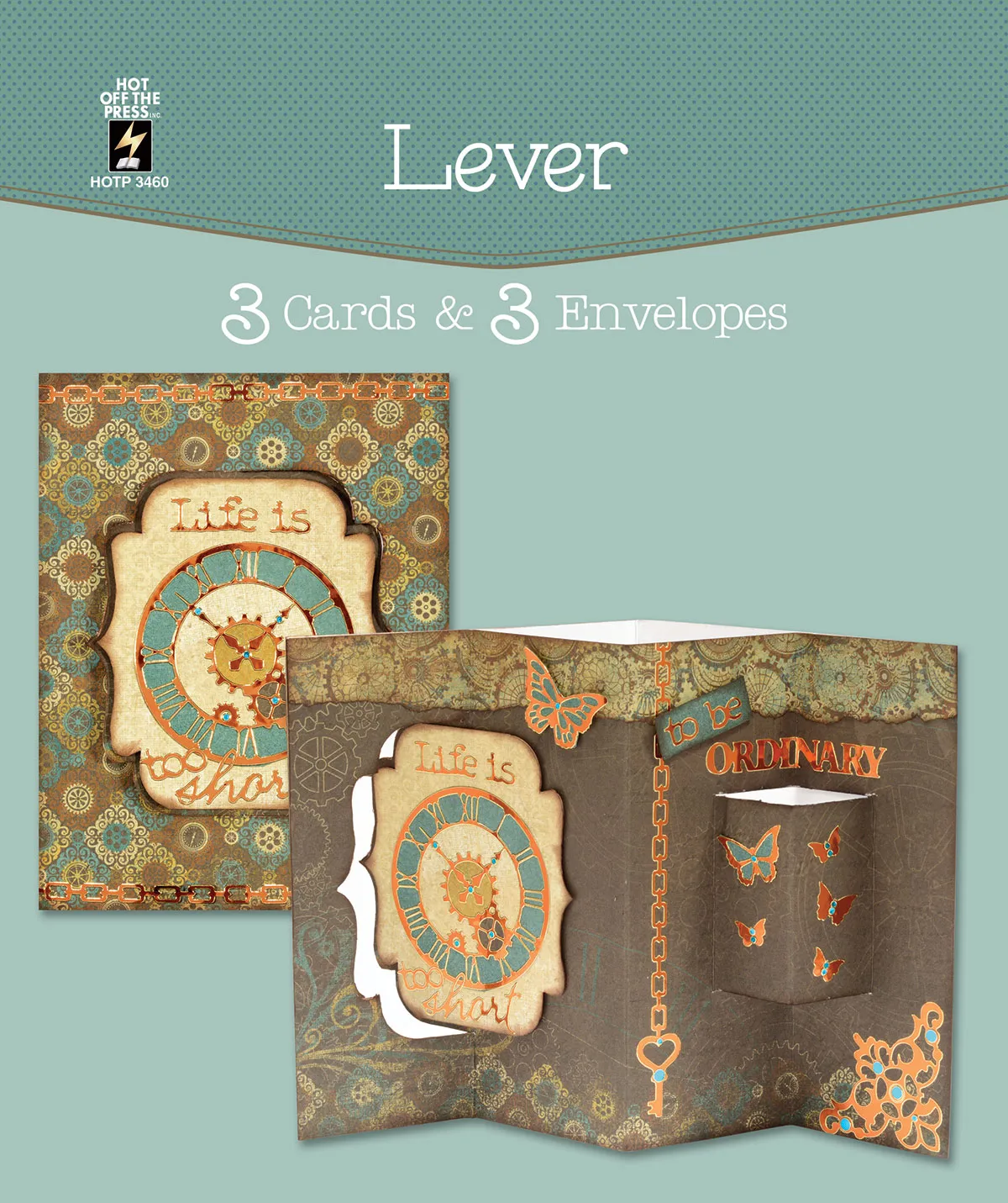 Movable cards the easy way! Lever Die-Cut Cards from Hot Off The Press feature a unique lever action that swivels the front die-cut panel as the inside pops out! You'll receive 3 blank cards (80# cover stock) and matching envelopes, along with a project idea to get you started. Instructions are included. Download patterns to cover your card below!