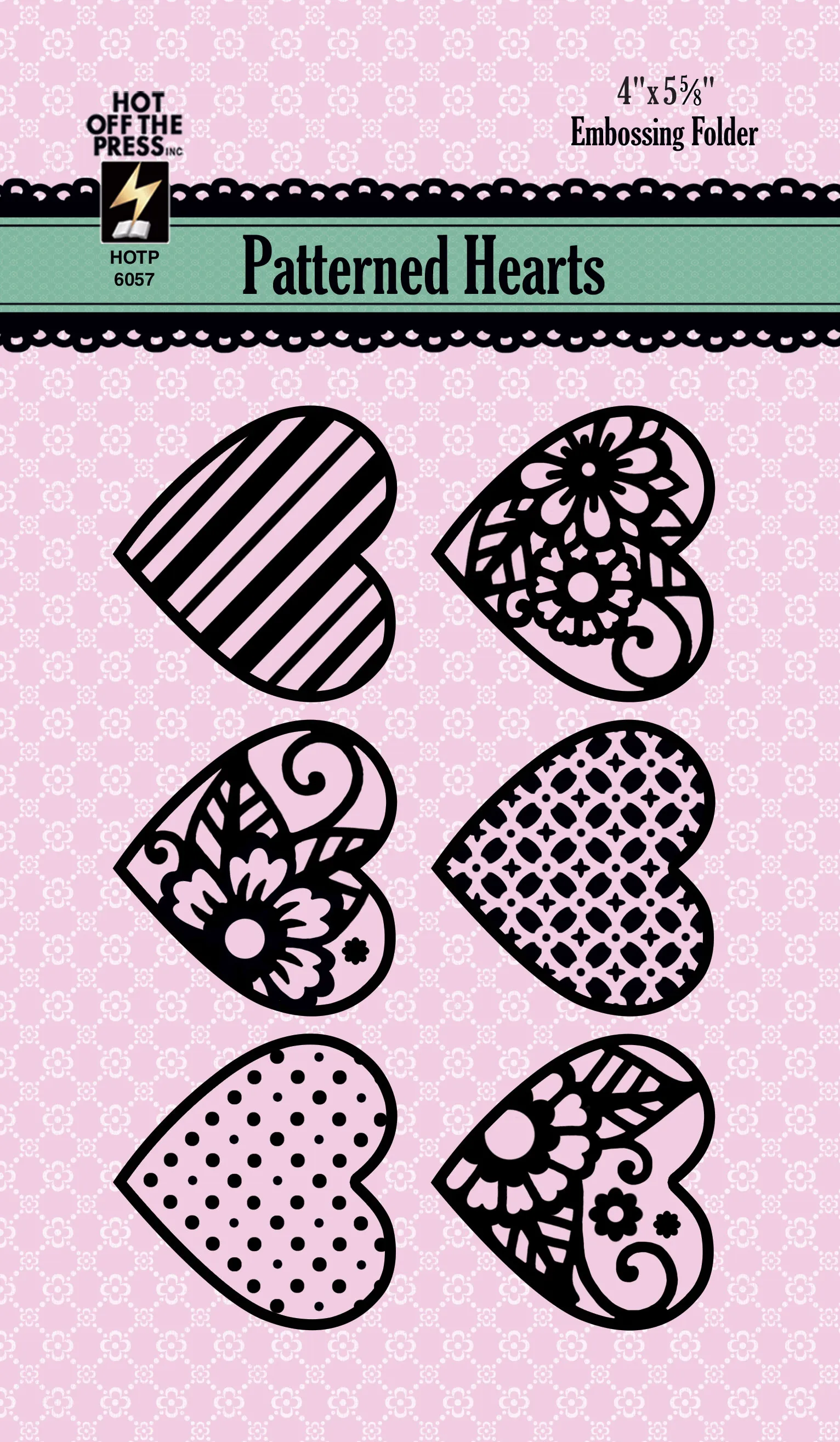 Pretty patterned hearts! The Patterned Hearts Embossing Folder from Hot Off The Press creates 6 charming hearts, each with a unique pattern! Emboss them as a set or cut them apart for sweet accents in card making, scrapbooking, or any paper crafting! Hot Off The Press embossing folders come with the design silk screened onto the folder front, making it easy to identify in your crafting stash! This embossing folder measures 5 7/8"x4 1/8" and is designed to work with most leading die cutting machines, including the Big Shot (