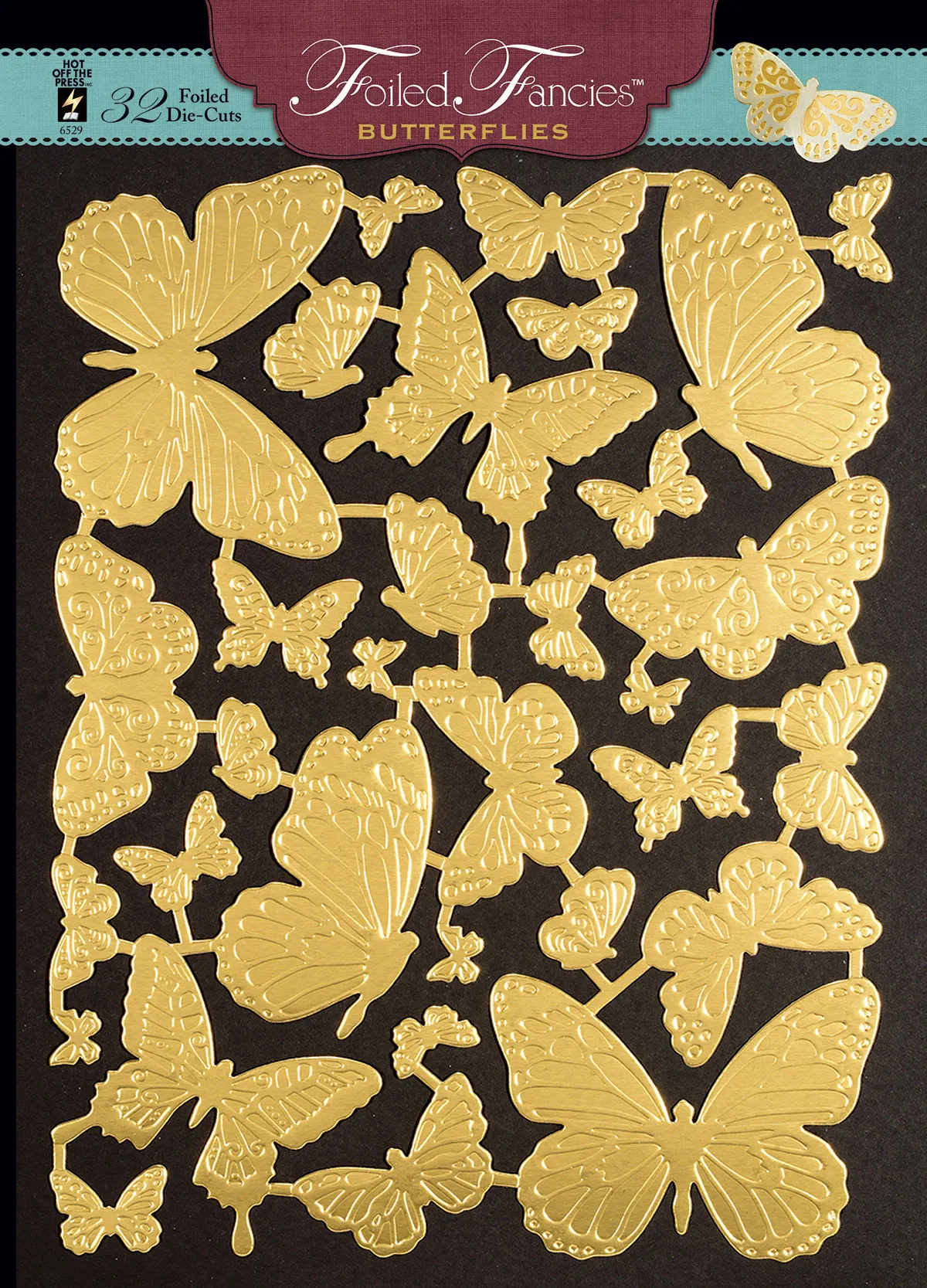 32 foiled & embossed golden die-cuts by Hot Off The Press! Butterflies Foiled Fancies™ are foiled & embossed, heavyweight paper embellishments featuring stunning butterfly designs in many shapes & sizes. Just clip them off the connector and use as is or sand, paint, ink or add embossing powder to enhance these artful accents!