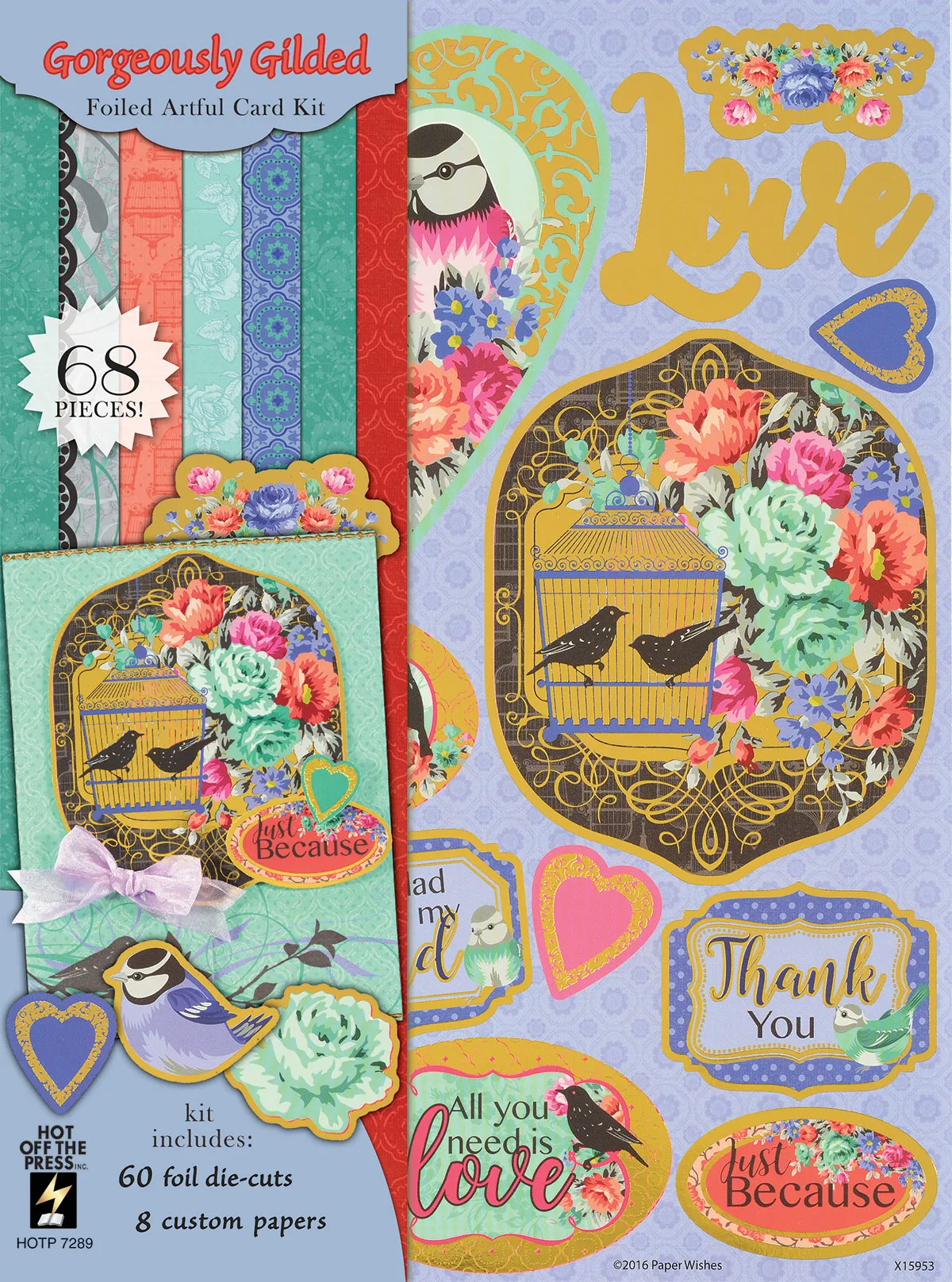 Elegant gold-foiled birds & flowers for card making! The Gorgeously Gilded Foiled Artful Card Kit by Hot Off The Press is packed with 68 pieces for creating amazing cards with ease. This kit includes 60 foiled die-cuts and 8 custom 8.5"x11" papers in vibrant teal, red, and coral tones. The die-cuts feature stunning flowers and sweet birds, along with a variety of greetings and borders! Included are beautiful ideas to get your creative juices flowing! Perfect for creating layered cards, scrapbook pages, gift tags and more! You'll also receive project ideas and tips to jumpstart your creativity. For even more creative convenience, be sure to check out Hot Off The Press' Little Birdies Artful Card Kit (link).