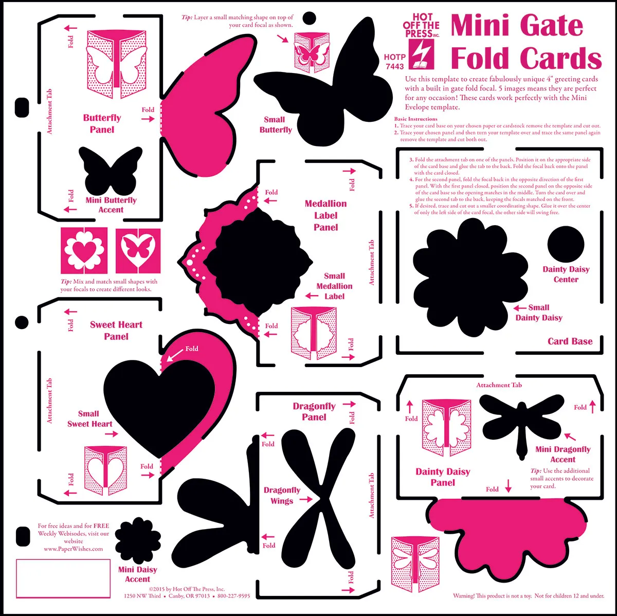 Create fabulous gate fold cards! The Mini Gate Fold Cards Template from Hot Off The Press allows you to create an endless supply of cards with built-in focals. Butterfly, heart, label, daisy and dragonfly—all in one template! Simply trace the template, cut out, fold and glue as instructed to create incredible handmade cards. Embellish your card with scrapbooking papers, ribbons, Paper Tole die-cuts or anything you choose. Perfect for creating unique cards for any occasion! Be sure to check out other Hot Off The Press Templates including Christmas Mini Gate Fold Cards Template (link) and Mini Envelope (link).