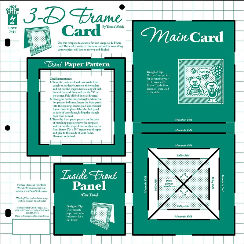 Fun-to-fill frame cards! The 3D Frame Card Template from Hot Off The Press lets you create unlimited 3D Frame cards that feature a clever, dimensional frame to decorate and embellish any way you like! Finished card is 5"" square.