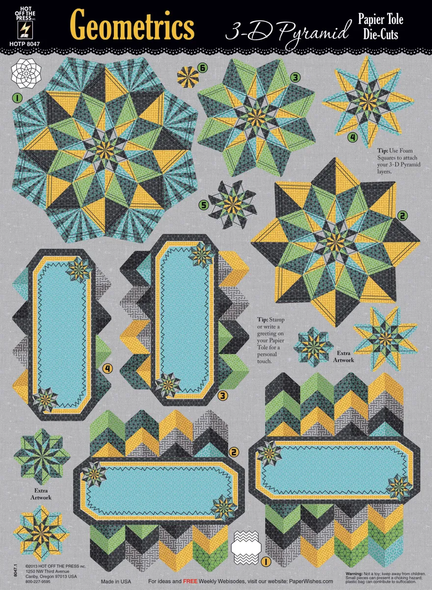 Daze them with Geometry! This Geometrics 3-D pyramid paper tole by Hot Off The Press is smart and sharp, and adds a level of intricacy to any project. This bold collection contains 4 designs on 2 sheets, plus extra artwork. Stack the layers with foam tape according to the numbered instructions and be wowed by the eye-catching shapes and visual movement! These paper tole designs can be used in card making, scrapbooking and album covers. Try matching with the Geometric paper pack (