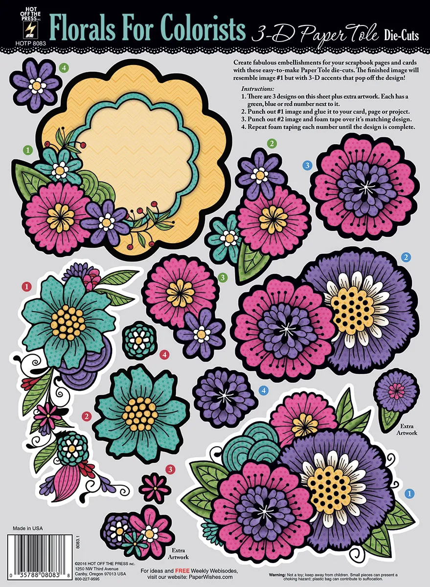 Adorable floral die-cuts for layering! Florals for Colorists Paper Tole makes it easy to create beautiful dimensional embellishments with these easy-to-use out images. Simply layer by number with foam tape for a fabulous 3D embellishment that can be added to any project — no cutting or measuring! Includes 3 different designs plus extra pop-out artwork that can be used to add the finishing touches to card making projects, scrapbook albums, gift tags and more! Be sure to see the rest of Hot Off The Press' Colorists collection including Colorists Double-Sided Scrapbooking Papers (link) and Colorist Scrapbooking Dazzles™ (link).