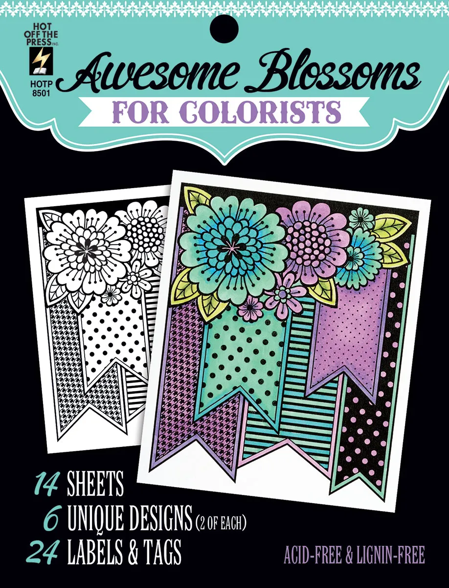 For Colorists! Hot Off The Press' Awesome Blossoms for Colorists is an adult coloring book designed just for cardmakers and paper crafters. Inside you'll find artfully awesome flowers just waiting for a splash of color! You'll also get coordinated banner, tag and label cut-outs. Color these images with inks, chalk, Spectrum Noir™ pens, watercolor pencils, anything! Your colored images are perfect for card making, scrapbooking, art journals and more. And don't forget, coloring relieves stress!