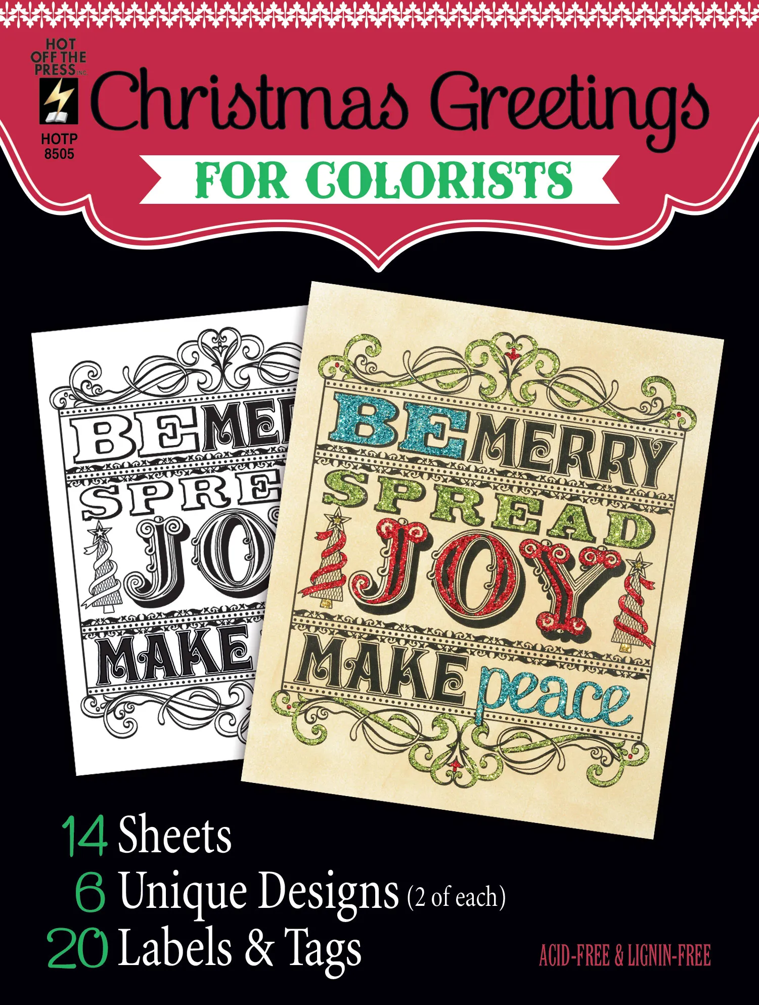 For holiday Colorists! Hot Off The Press' Christmas Greetings for Colorists is an adult coloring book designed just for cardmakers and paper crafters. Inside, you'll find artfully design Christmas designs waiting for a splash of festive color! You'll also get coordinated tag and label cut-outs! Color these images with inks, chalk, Spectrum Noir™ pens, watercolor pencils, anything! Your colored images are perfect for card making, scrapbooking, art journals and more. And don't forget, coloring relieves stress!