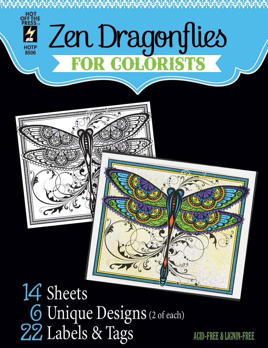 Just for Colorists! Hot Off The Press' Zen Dragonflies for Colorists is an adult coloring book designed just for cardmakers and paper crafters. Inside, you'll find intricate and artful dragonfly designs just waiting for a splash of color! Includes 22 beautiful, coordinated labels and tags. Color your pages with inks, chalk, Spectrum Noir™ pens, watercolor pencils, anything! Your colored images are perfect for card making, scrapbooking, art journals and more. Easy to carry or tuck in your purse while waiting for an appointment. And don't forget, coloring relieves stress!