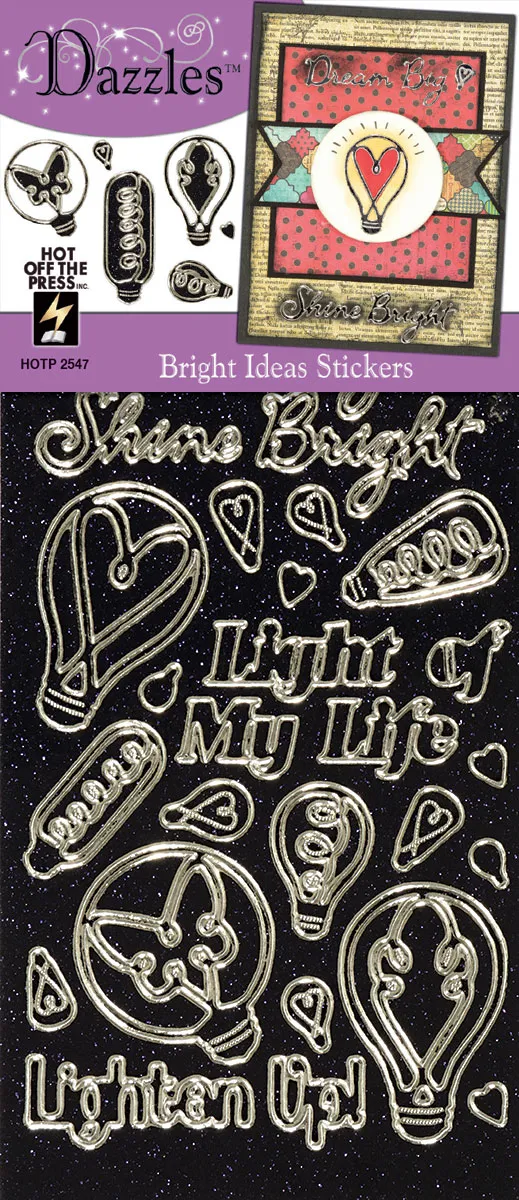 3Pack - Bright Ideas Dazzles! 126 stickers, including light bulb, heart and greeting stickers! You’ll love the look of a heat-embossed image—but all you do is peel and stick! Even better, your Dazzles™ also come packaged with an idea sheet showing a finished card idea, additional ideas for using Dazzles™. Now it’s quick and easy to add dazzle to your projects!