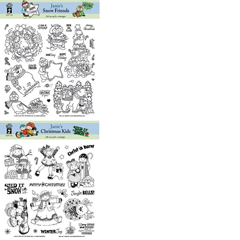 Stamp these sweet kids and critters on all your holiday card making, scrapbooking, and other paper crafts! You’re really going to enjoy these playful holiday Janie’s stamp sets by Hot Off The Press! You'll get a total of 43 delightful clear acrylic stamps in 2 sets, each on an 8”x8” sheet. Use these cute stamps on handmade cards, as accents on scrapbook pages, on gift bags, tags, holiday decorations, and so much more. There are even designer tips and ideas on the back of the package.