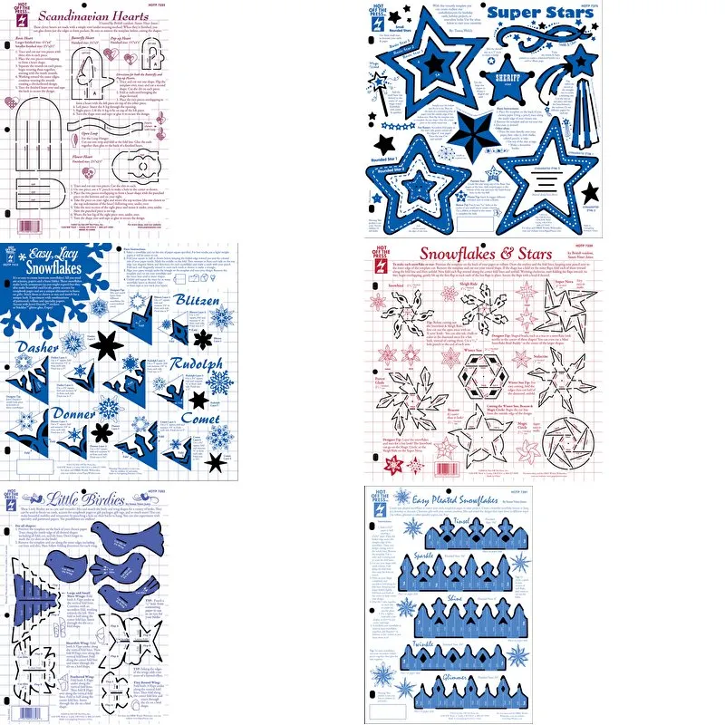 Use the designs for card making, scrapbooking, ornaments, gift bag decorations, tags, and much more! All the templates are heavy-weight plastic and include complete directions for cutting and constructing the designs. They are reusable and 3-hole punched so they can be stored in a 3-ring binder.