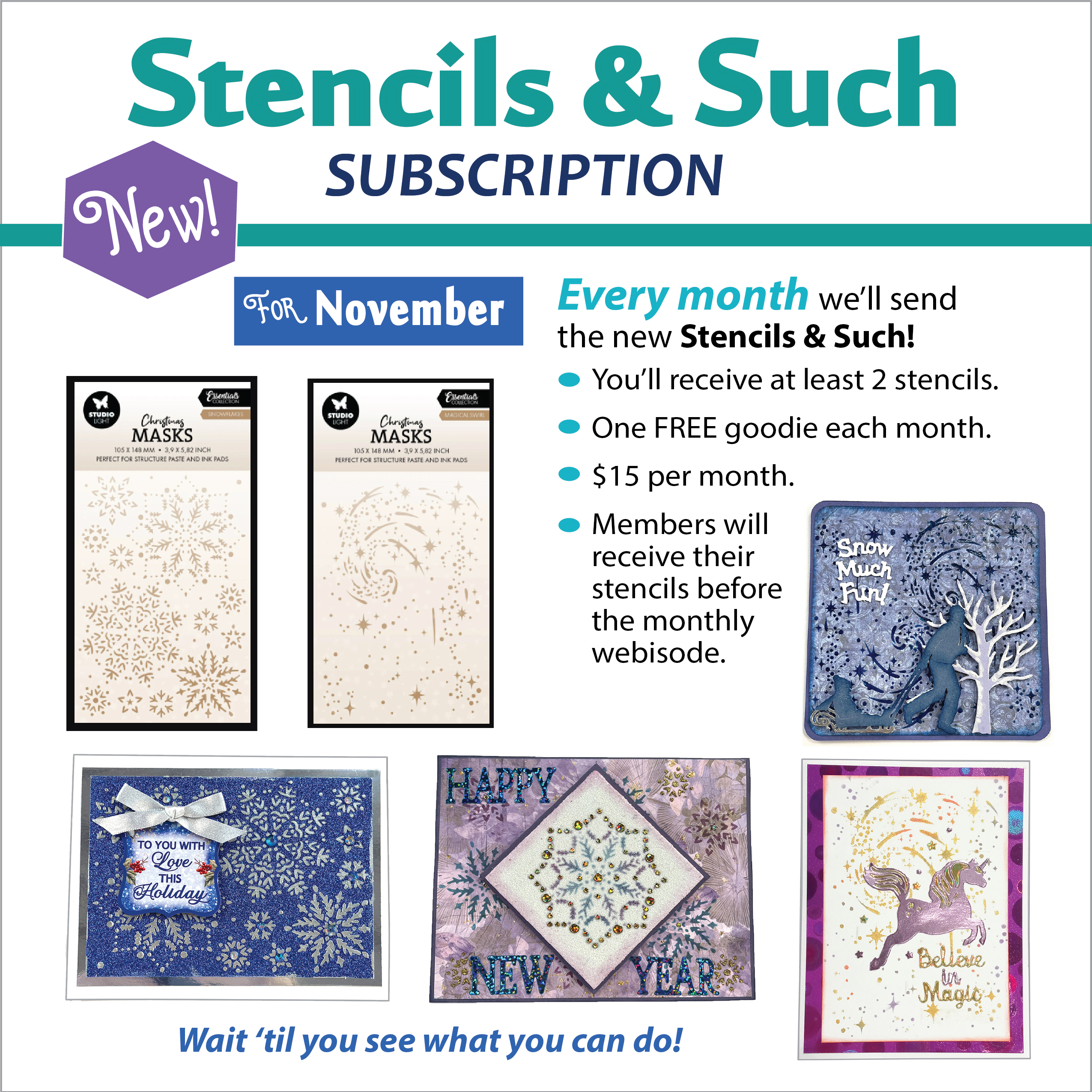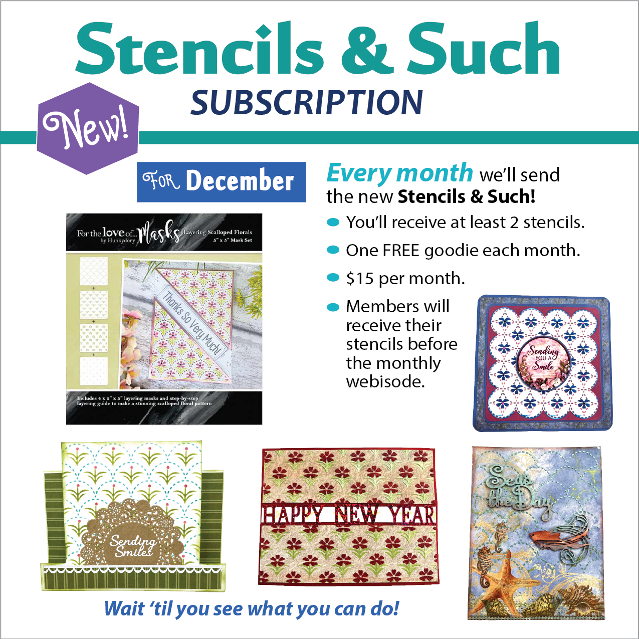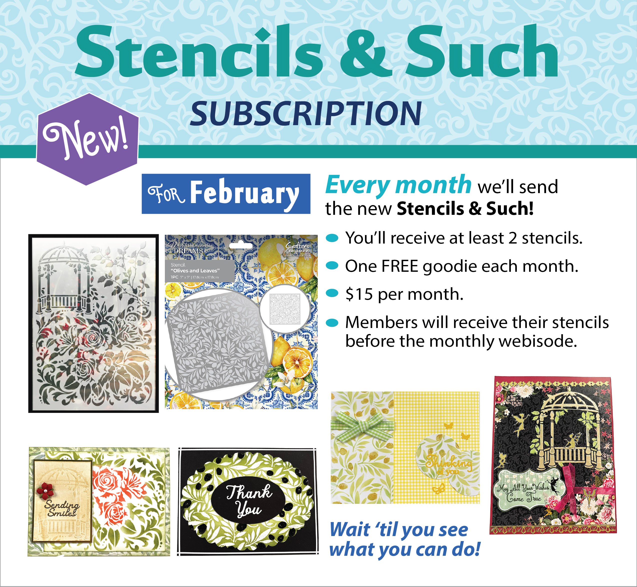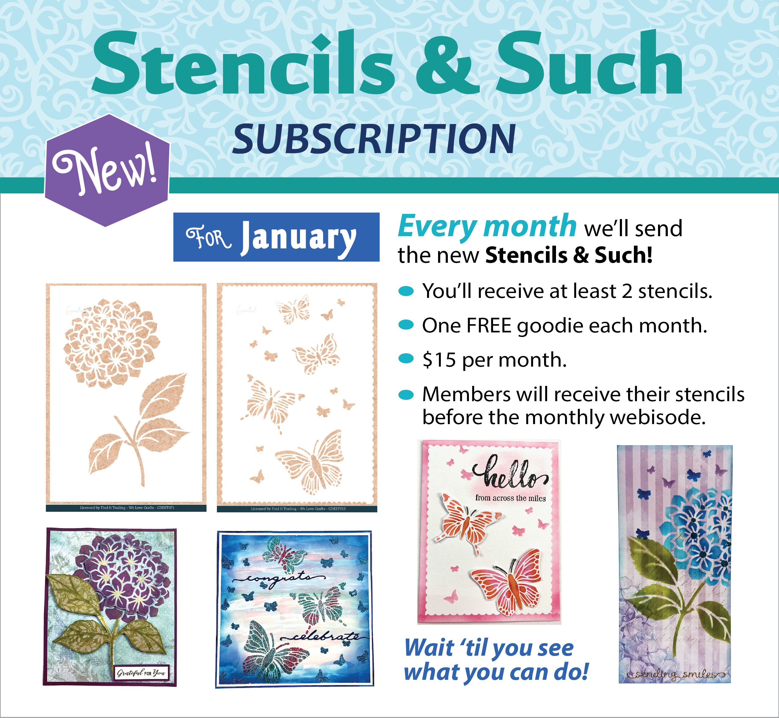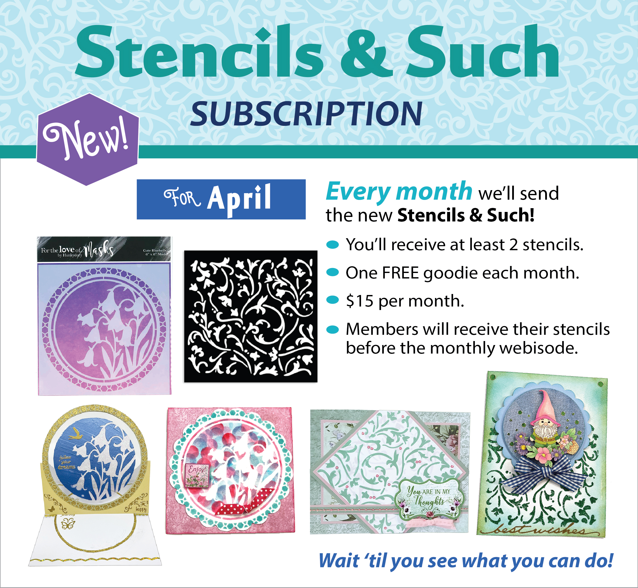 Every month members will receive the new Stencils & Such! You'll receive at least 2 stencils and a FREE goodie each month. Always $15 a month plus shipping. Your subscription will ship before the webisode each month. We don't just sell you product, we teach you how to use it!